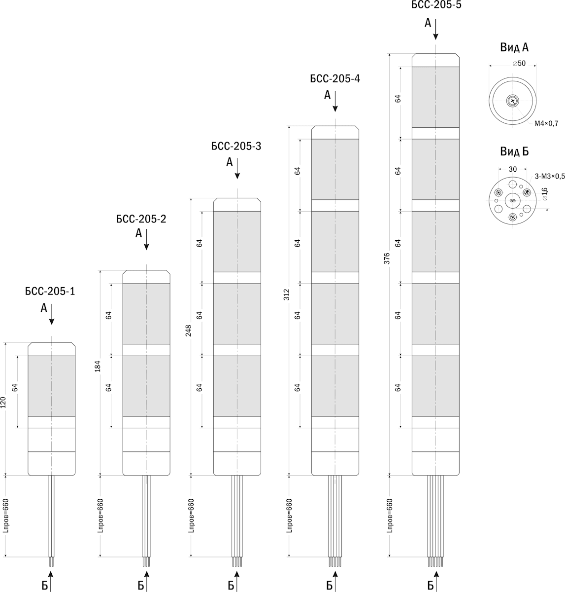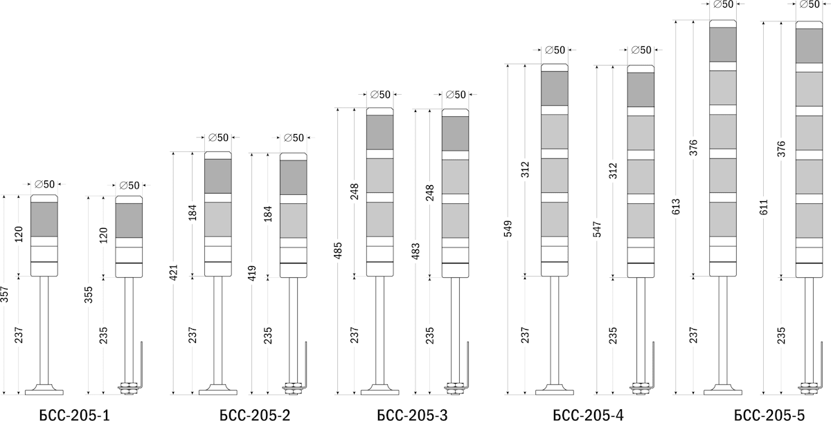 Сигнальные лампы БСС-205 – круглого сечения с одной, двумя, тремя, четырьмя или пятью светодиодными секциями красного, желтого, зеленого, синего и белого цветов. Конструктивно каждый световой сегмент представляет собой 4 платы управления, расположенные по кругу, с припаянными к ним светодиодами (рис. 1, рис. 2).