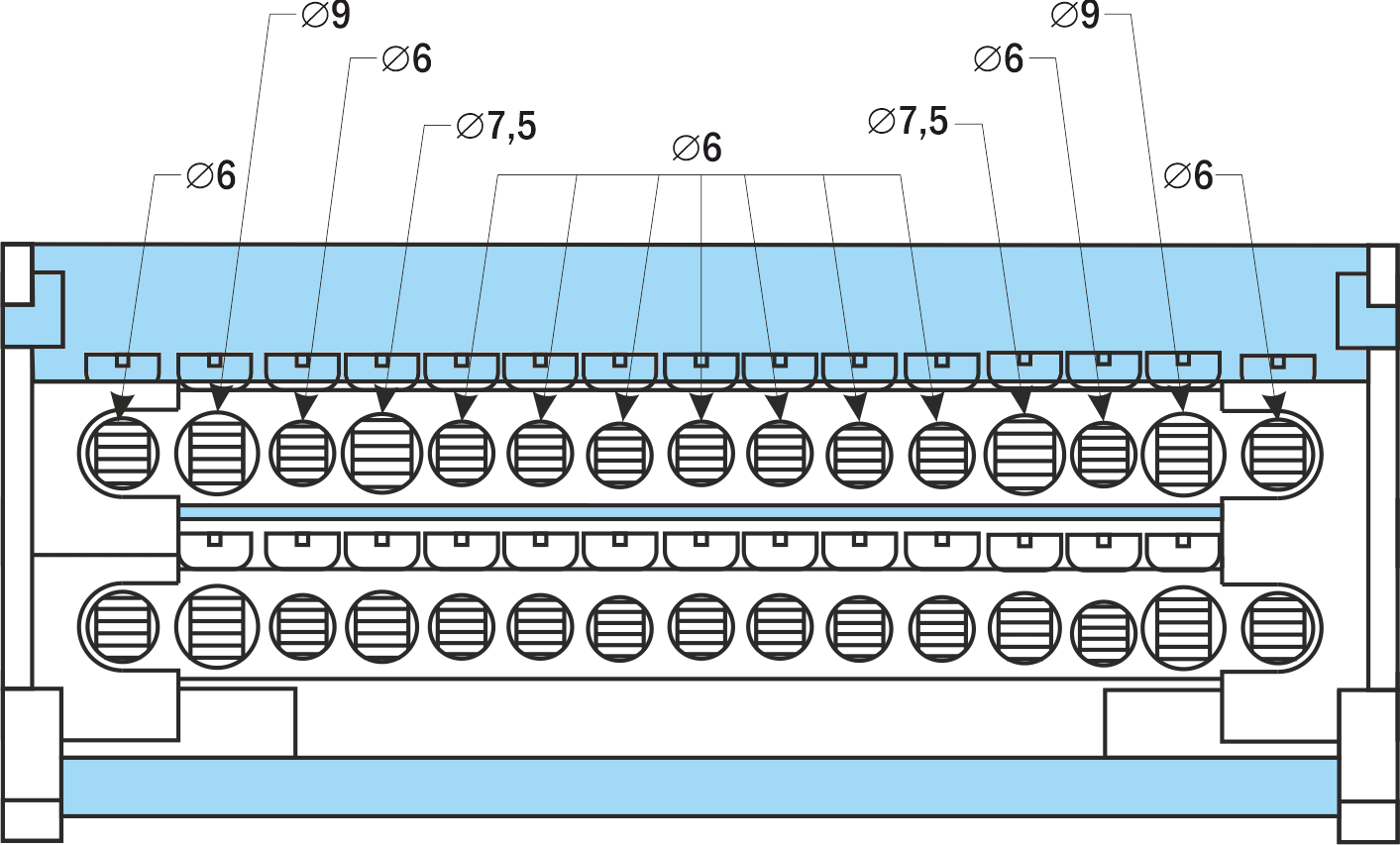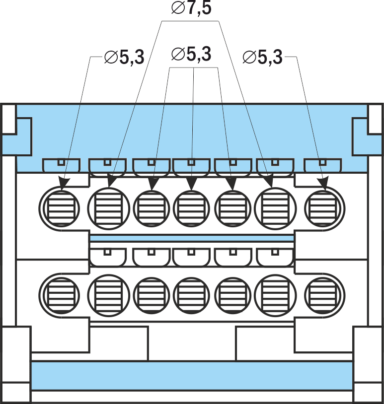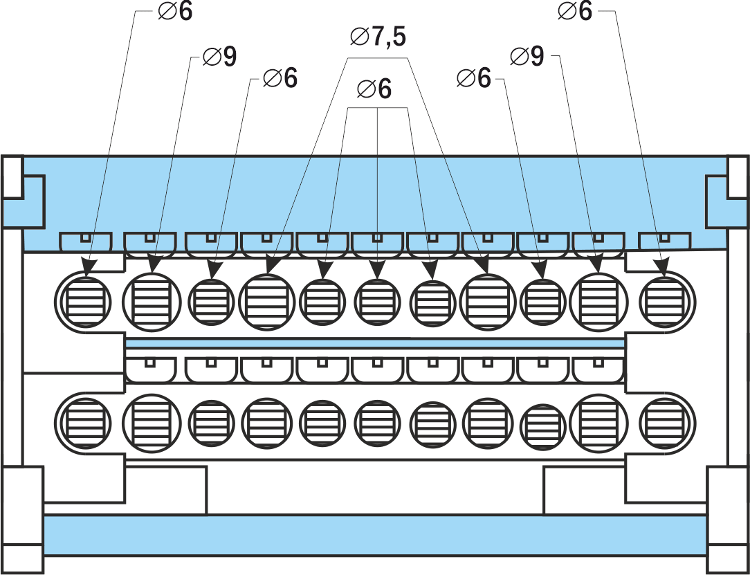 | Количество и диаметр отверстий для подключения в 1 шине | 5×∅ 5,3 мм | 2×∅ 7,5 мм | 7×∅ 6 мм | 2×∅ 7,5 мм | 2×∅ 9 мм | 11×∅ 6 мм | 2×∅ 7,5 мм | 2×∅ 9 мм |