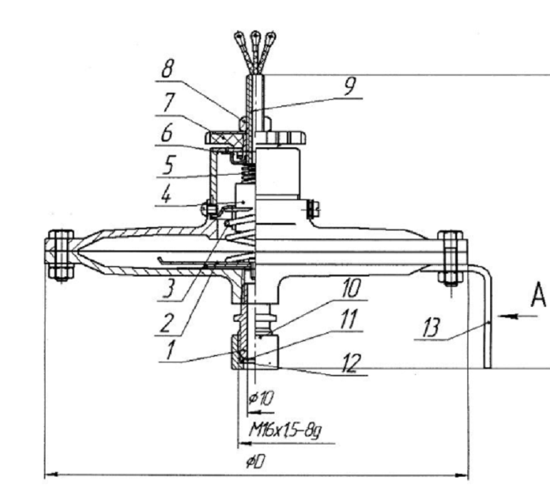 1 – штуцер; 2 – мембранный чувствительный элемент; 3 – настроечная пружина; 4 – микропереключатель; 5 – пружина; 6 – фиксирующая шайба; 7 – маховик; – гайка; 9 – втулка; 10 – гайка; 11 – заглушка; 12 – кольцо уплотнительное; 13 – кронштейн. |